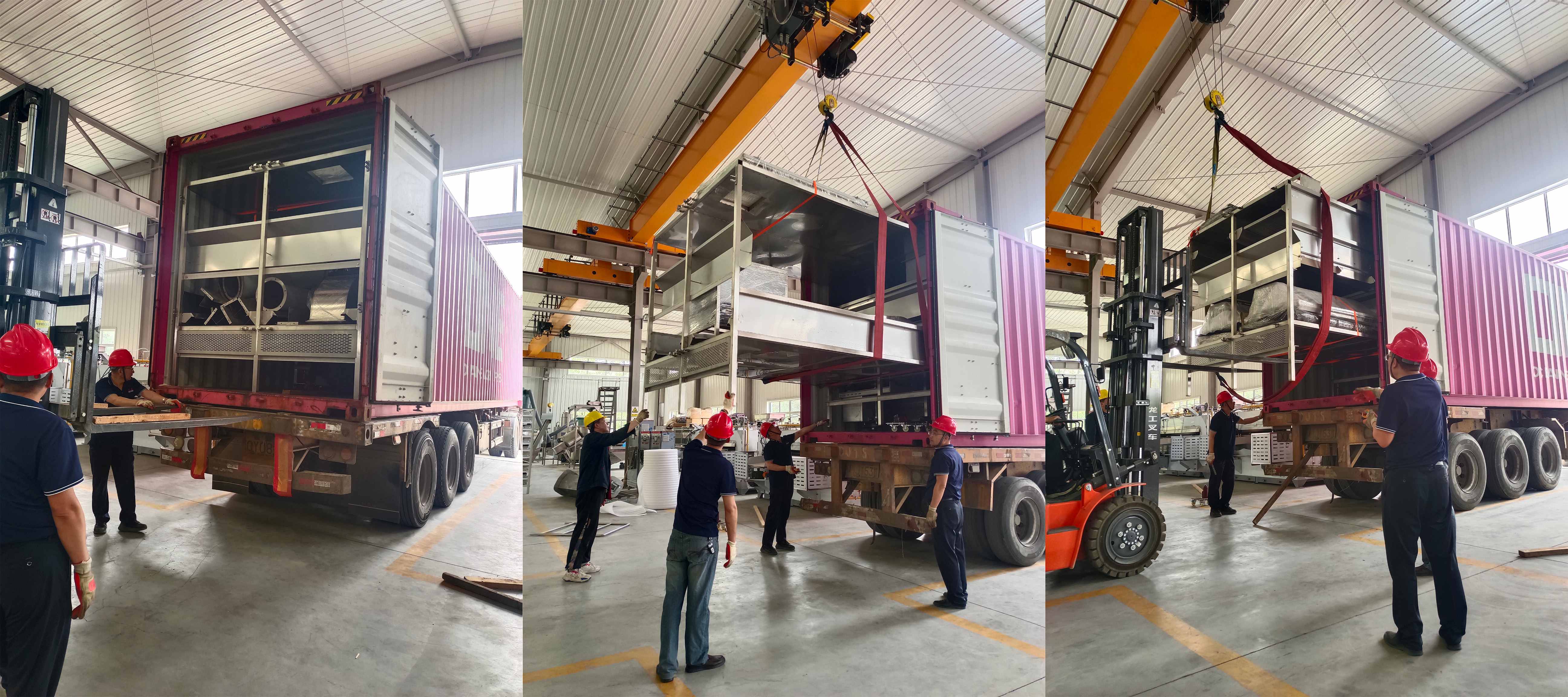 國外客戶的多功能連續烤爐發貨了!本次發貨共4 個集裝箱,發貨工作正緊張而忙碌地進行著。現場一片熱火朝天的景象,每一個環節都在有條不紊地推進。