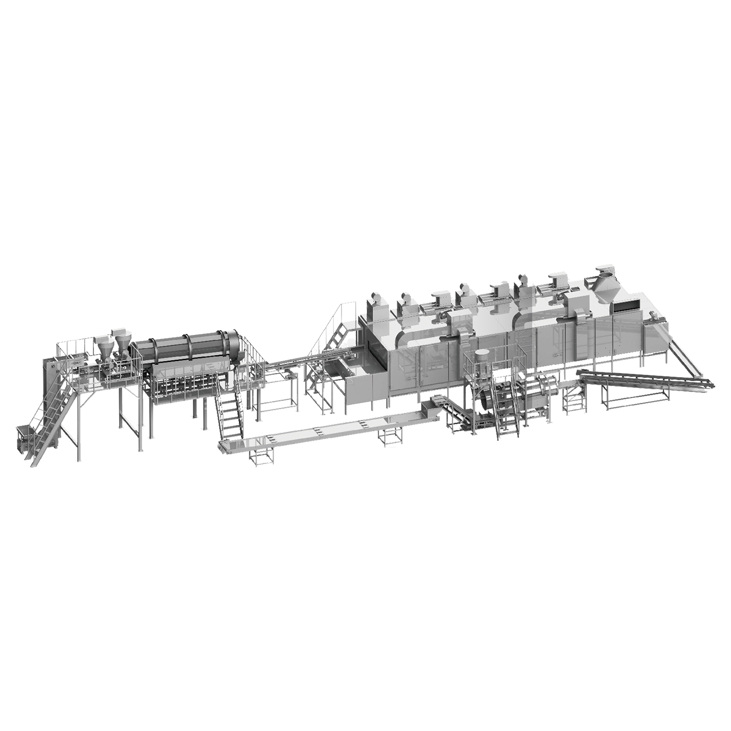 工藝流程原料提升→一次調味→輸送→烘烤→輸送→二次調味→揀選